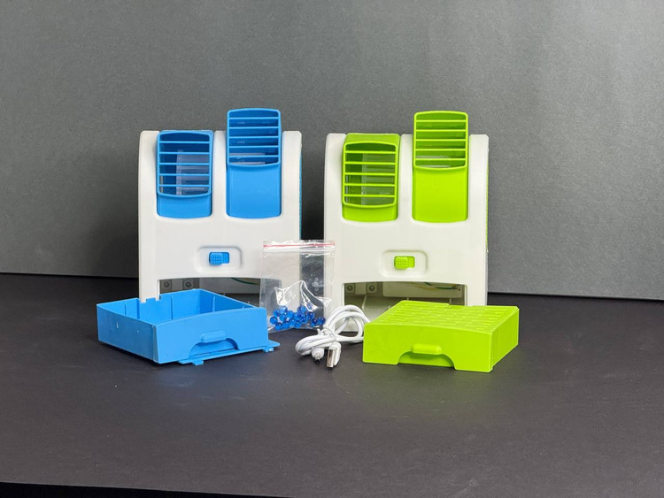 مینی کولر رومیزی دارای مخزن آب با وزنی حدود 400 گرم و ابعاد کوچکی به مقدار 11*11.5*13.5 سانتی متر، قابل استفاده در هر مکانی می باشد. این کولر می تواند انرژی را از 3 باتری قلمی 1.5 ولتی یا از طریق کابل USB با اتصال به لپتاپ و یا پاور بانک، بدست بیاورد.